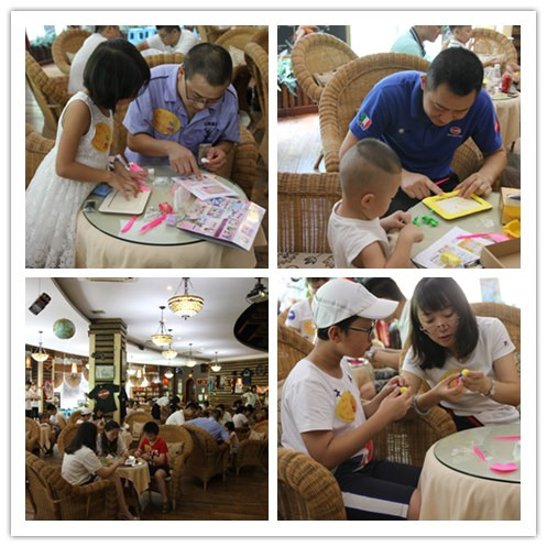 參觀結束后,家庭團來到咖啡廳,公司領導致歡迎詞并對企業情況進行簡單的介紹。隨后,含谷基地的家庭開始進行互動交流。該環節的內容是以家庭為單位進行相框DIY制作,旨在通過手工活動的形式,增進家庭的親情互動。整個制作過程中,各位小朋友在家長的幫助下,專心致志地、聚精會神地捏著手中的橡皮泥,一家人齊心協力,相互幫助,爭取最快最好地完成相框的制作。